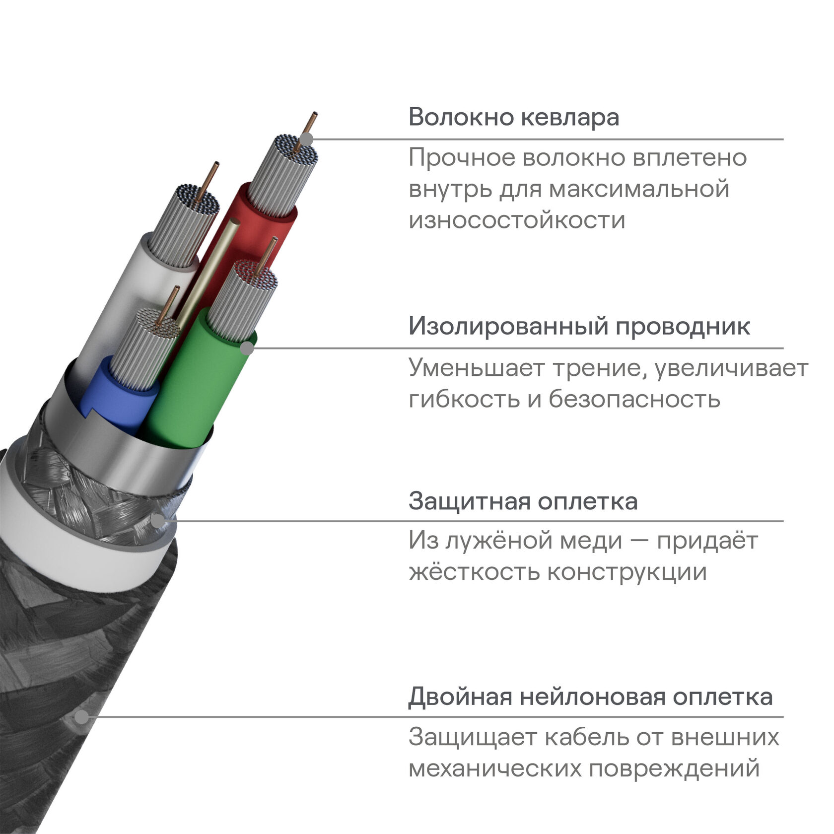 - Волокно Kevlar в основе кабеля для исключительной прочности и долговечности.